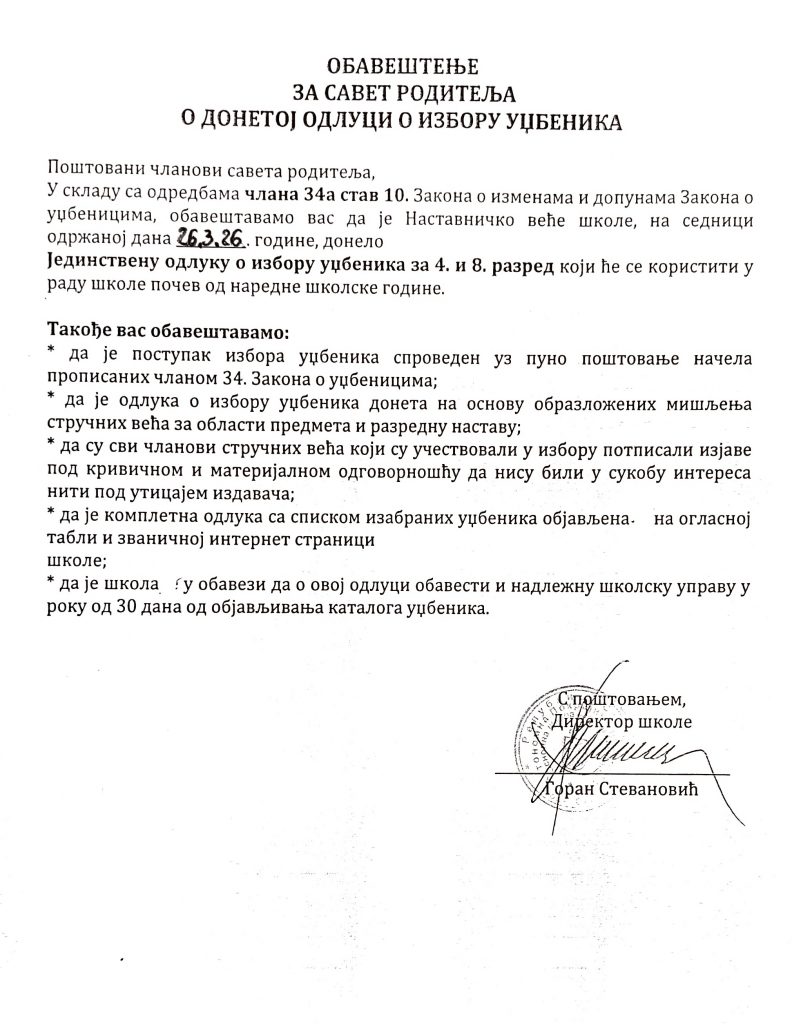 Бесплатни уџбеници 2026/2027 – Допис родитељима