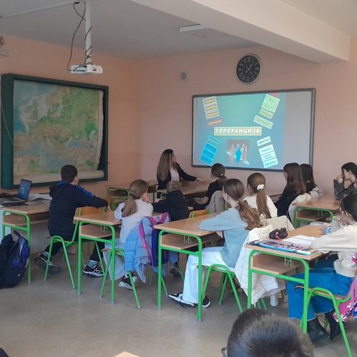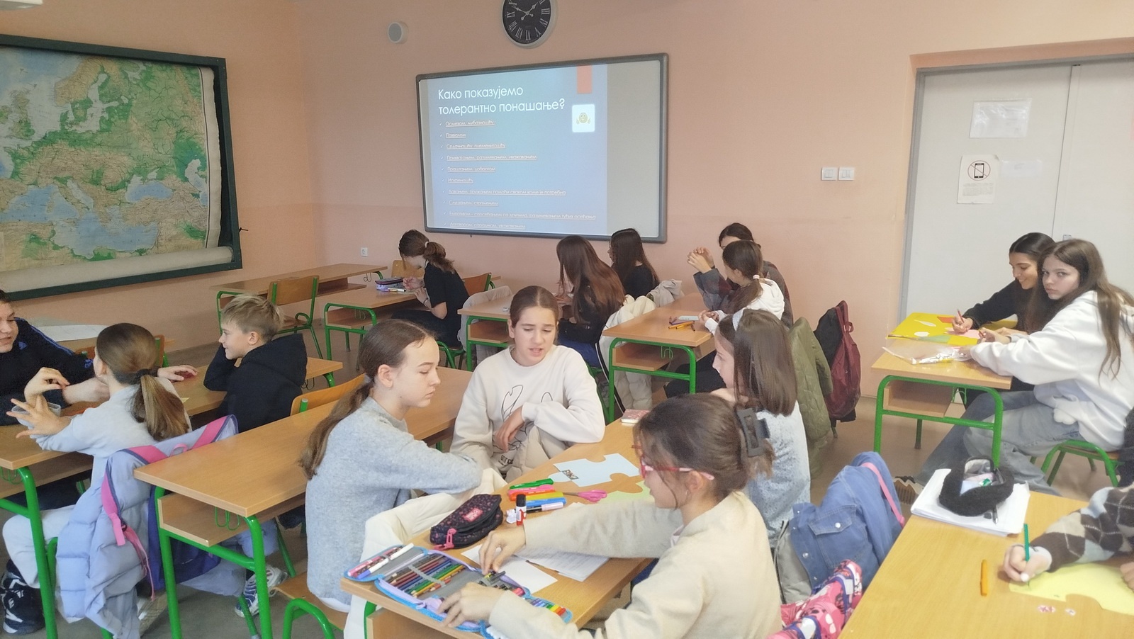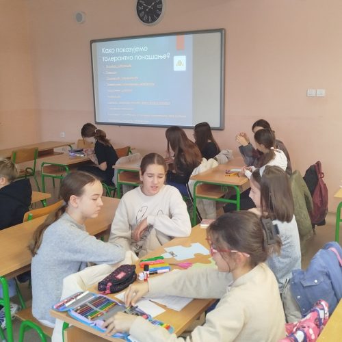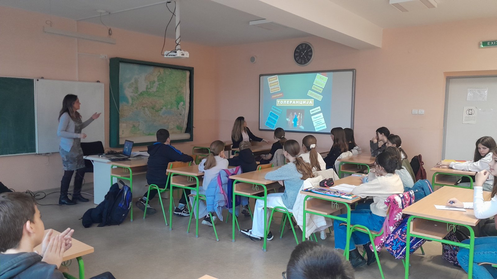 Активност је започета разговором о томе шта је толеранција и зашто је важна, односно кроз игру асоцијације ученици су откривали примере који су их наводили да закључе која је тема нашег сусрета. Кроз презентацију и међусобну интеракцију посебан акценат је стављен на то како постајемо толерантни и када смо толерантни, затим на разумевање туђих осећања, прихватања различитости и мирно решавање конфликта, са акцентом на заузимање става и свог мишљења, али исто тако и уважавања мишљења другог. Ученици су наводили примере толерантног и нетолерантног понашања, а водитељи су одглумили ситуацију нетолерантног понашања, на примерен и занимљив начин, након чега је уследила дискусија.
