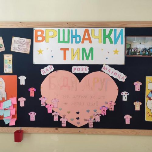 Радионице и перформанс у ђачком холу Дан борбе против Вршњачког насиља. Члан Вршачког тима ученица Тара Танацков 7/3 и Симона Малбаша 8/4 одељења су на разглас школе прочитале и указале на значај овог датума и прочитала причу о Дану розих мајица, а током малих одмора је на разглас школе пуштана песма „Не ругај се“.